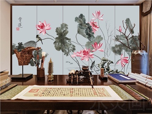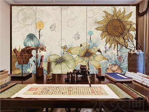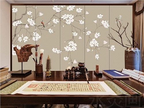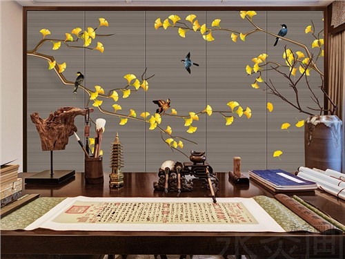 软包背景墙_新中式花鸟银杏叶子硬包永灸供